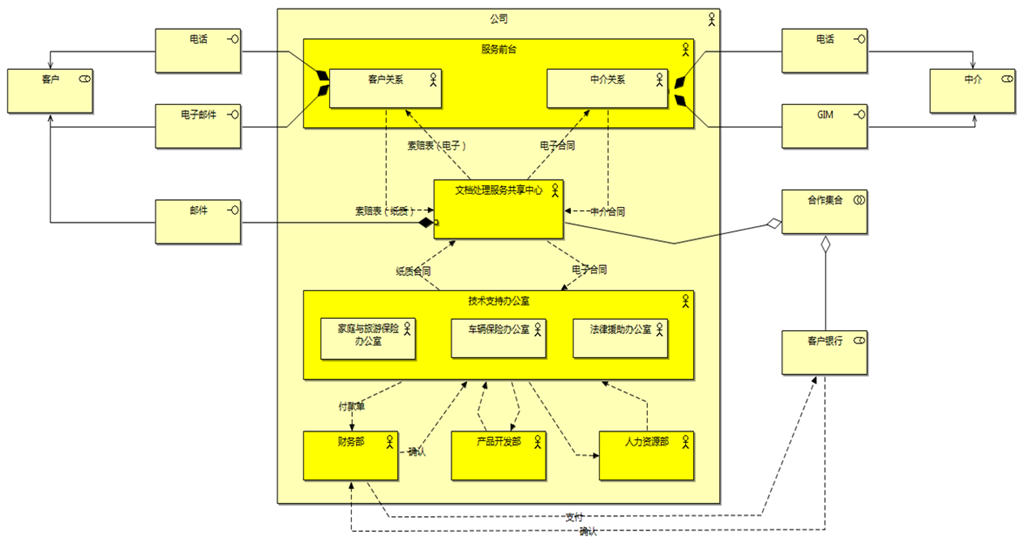 参与者合作视角关注于各业务参与者与外部环境之间的关系。此视角一个常见的例子就是背景图(Context diagram),他描述了组织与包括客户、供应商和其他业务伙伴在内的外部环境之间的关系。此视角在明确组织的外部依赖和合作关系,展示其价值链这些方面都非常有用。除此之外,该视角还可以被用来展示各业务参与者和/或各应用组件是如何通过相互结合来实现各个业务流程。