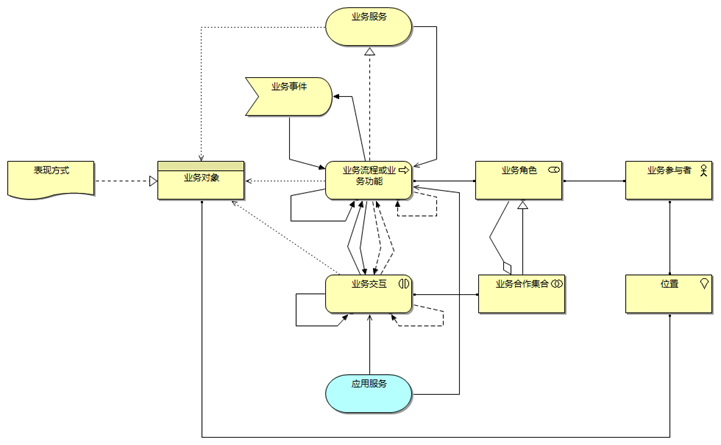 业务流程视角在一个较高的概括层次对企业中的一个或多个业务流程的组成和结构进行描述。除了与业务流程领域所涵盖的概念之外,此视角还包括了如下的与业务流程各概念元素直接相关的元素: