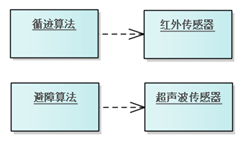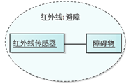 Collaboration Use (协作使用)在特定情境下使用协作模式的方式,将协作中的角色绑定到具体的分类器或实例。它是对协作的一种特定应用,用于解释一组元素之间的关系。 图例 协作使用 - 红外线避障,是避障协作的一种特定应用。它通过无人小车的红外线传感器进行探测障碍物。