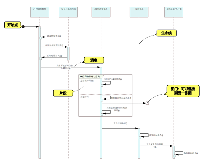 如下是UML顺序图的图例《无人车系统紧急避障》。