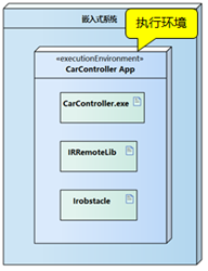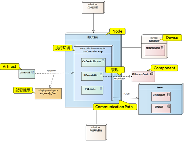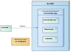 上图中无人红外遥控避障小车的部署工作是:红外遥控器( device )向嵌入式系统( node )发送控制指令(比如 “ 前进 ” ),避障传感器模块( device )实时采集数据(比如检测到前方有障碍),并把数据传给嵌入式系统,嵌入式系统里的 CarController.exe (主程序)会调用对应的组件,例如接收遥控指令会调用 IRRemoteLib.dll (红外控制组件)解析指令,接收传感器数据会调用避障算法模块 Irobstacle.dll 分析障碍物,主程序再把 “遥控指令” 或 “避障指令” 转换成电机控制信号,通过电机驱动系统( device )让小车执行动作。