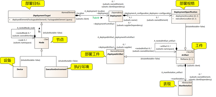 如下是根据《UML2.5.1建模规范》 编译的UML部署图的元素说明::
