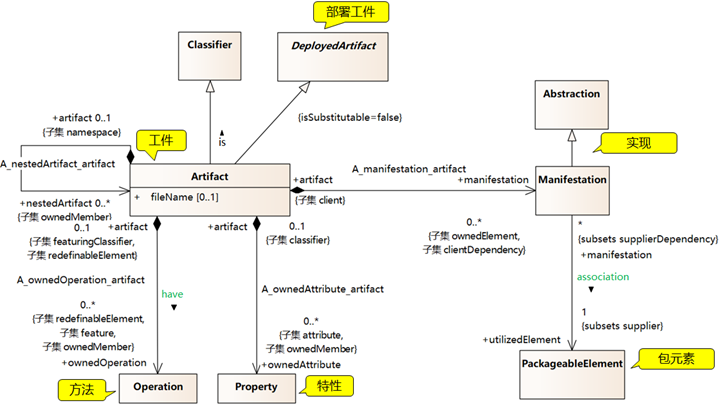 如下是工件(Artifacts)元模型,“工件”指的是某种(通常可具体化)的信息项,它是由软件开发过程或系统运行所产生的或使用的。工件的例子包括模型文件、源文件、脚本、可执行文件、数据库表、开发成果、文字处理文档以及邮件消息。